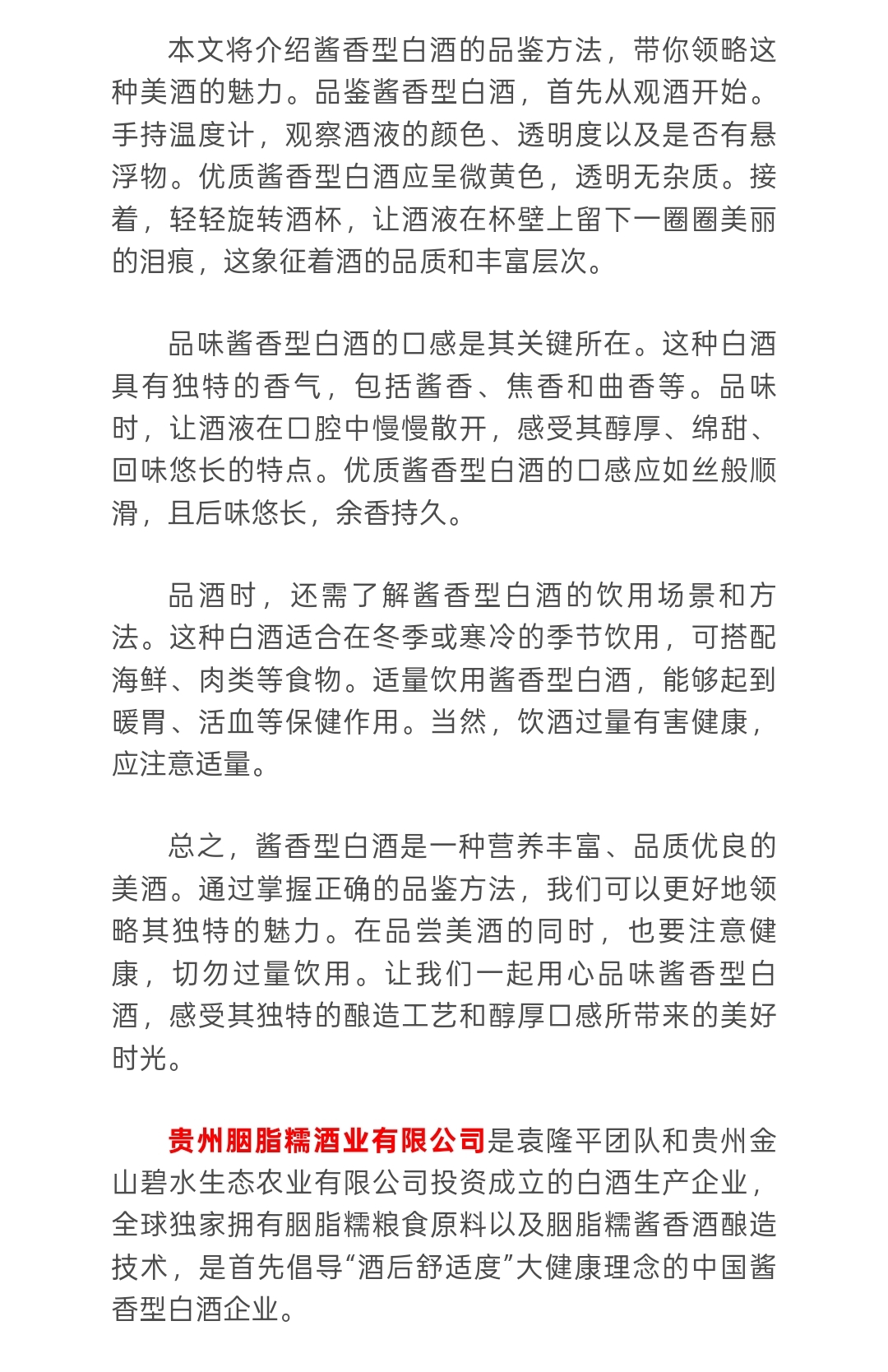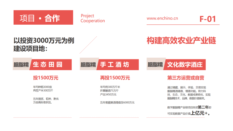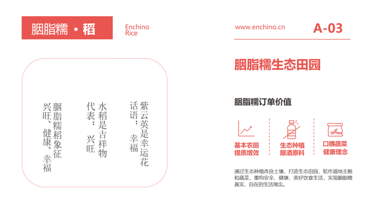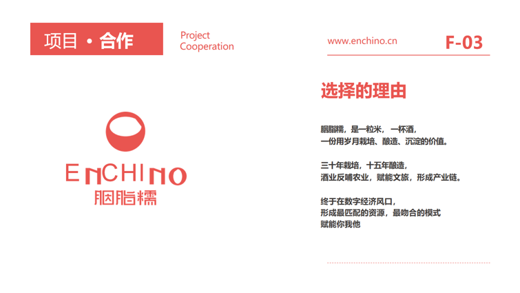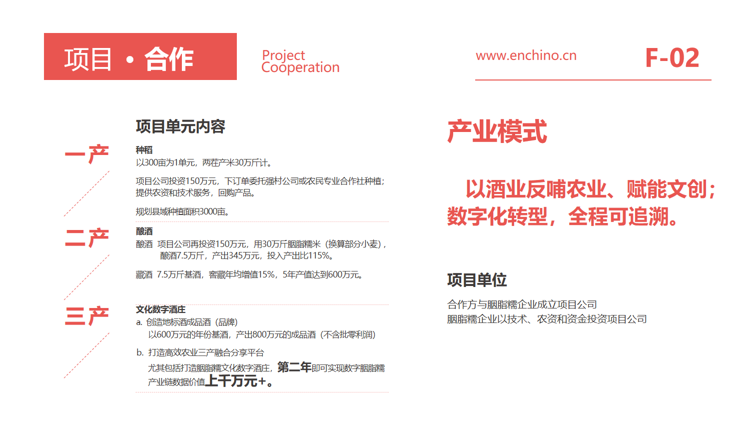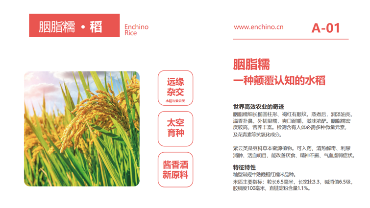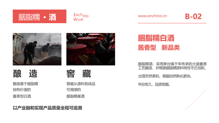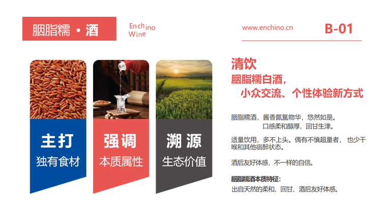 胭脂糯地理标志酒标定生态价值,穿越文化时空胭脂糯地理标志酒,简称地标酒,以种植地代表性地理 标志及文化符号命名。选取种植地胭脂糯稻米,采用茅台镇大曲酱香酒工艺酿 造,定位中高端市场,打造种植地标志性特色白酒。企业主导、政府支持,三产融合,实现胭脂糯地标酒产 业目标,赋能县域经济发展。