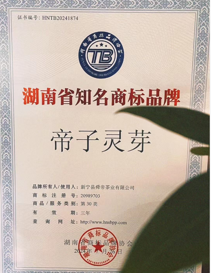 舜帝茶庄,成立于2015年,坐落于湖南野茶之乡新宁县舜皇山和湘商产业园,这里既有着5000年湘桂古道的厚重历史,也有着11万亩森林野茶的壮丽景观,还有56条纵横奔腾的溪谷灵韵。古道如今成了30里野茶长廊,绿意葱茏,茶香扑鼻,是自然与人文的完美交融,是一家涵盖“野茶基地、野茶工𠂆、山泉水厂、青钱柳工厂、文旅康养”为一体的国家级高新技术企业、湖南省农业产业化龙头企业和湖南省专精特新企业,已建立中国农技协新宁野茶科技小院、中南大学中药与天然药物大健康产业研究生联合培养基地、湖南农业大学和湖南省茶叶研究所产学研示范基地、湖南红茶传习所、邵阳市舜皇山野茶培育与加工工程研究中心等。沿古道前行,舜皇山老山界䇯立的纪念碑,是对长征历史和红色文化的缅怀,也是对未来的期许。每年野茶节,茶庄沸腾,茶友游客齐聚,重走长征路,翻越老山界,高山流水品野茶,感受茶文化的魅力。茶庄明星产品“帝子灵芽”,以独特风味和高品质著称,承载匠心,传递茶文化精髓。茶庄坚守“林茶草”古农法,尊重自然,孕育卓越茶叶。