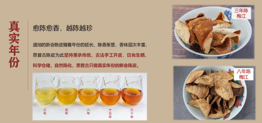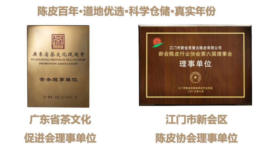 作为新会陈皮产品的源头企业之一,思普古同时荣任广东省茶文化促进会和江门市新会区陈皮协会的理事单位。公司始终秉持“陈皮百年,道地优选,科学仓储,真实年份”的经营理念,矢志打造“思普古”和“广陈虎皮”品牌,全力传承并发扬新会陈皮文化。