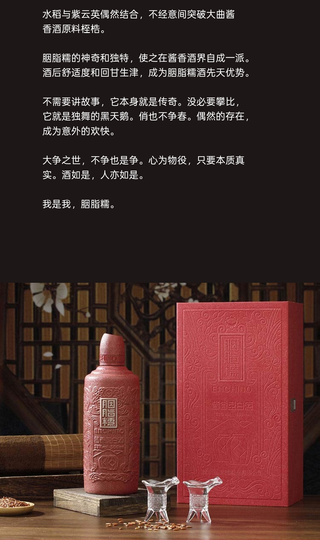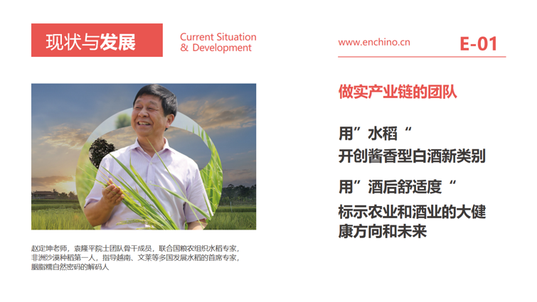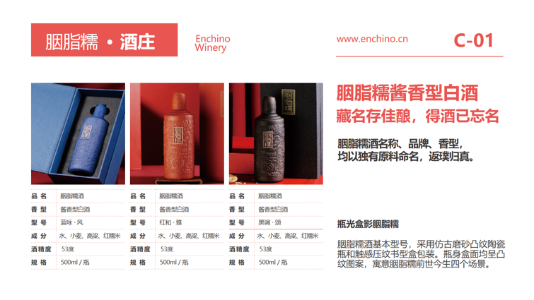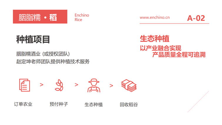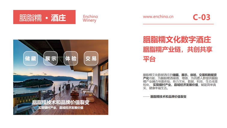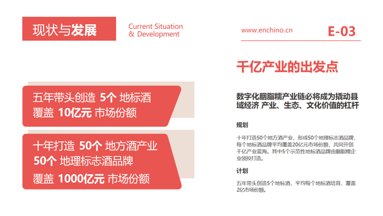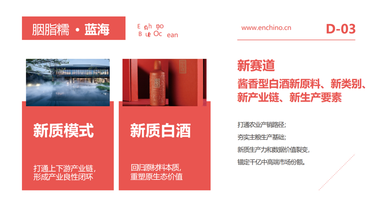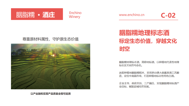 胭脂糯地理标志酒标定生态价值,穿越文化时空胭脂糯地理标志酒,简称地标酒,以种植地代表性地理 标志及文化符号命名。选取种植地胭脂糯稻米,采用茅台镇大曲酱香酒工艺酿 造,定位中高端市场,打造种植地标志性特色白酒。企业主导、政府支持,三产融合,实现胭脂糯地标酒产 业目标,赋能县域经济发展。