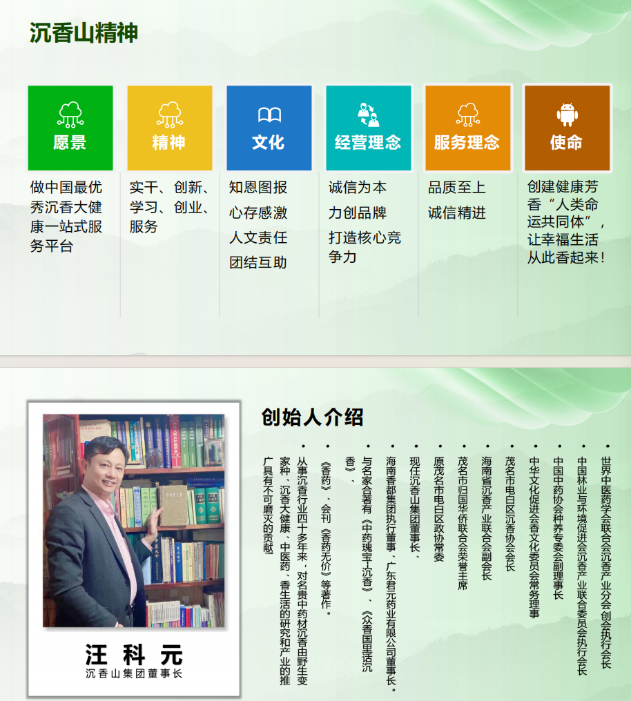 沉香山集团始终以传承香文化与中医药文化、佛医与道医文化为己任,推动芳香能量、沉香森林碳汇融入大健康产业,提倡绿色低碳体验芳香生活、延伸医养旅游服务,汇聚了各方科技精英与人才,以技术创新带动产品研发,不断发掘爆品、守正创新品,充分发挥沉香人不断进取的工匠精神,为社会创造更多就业岗位,为实施国家精准扶贫、振兴乡村共同富裕,执着绿色低碳循环发展生态产业体系,为地方政府增税创收作出积极的贡献!